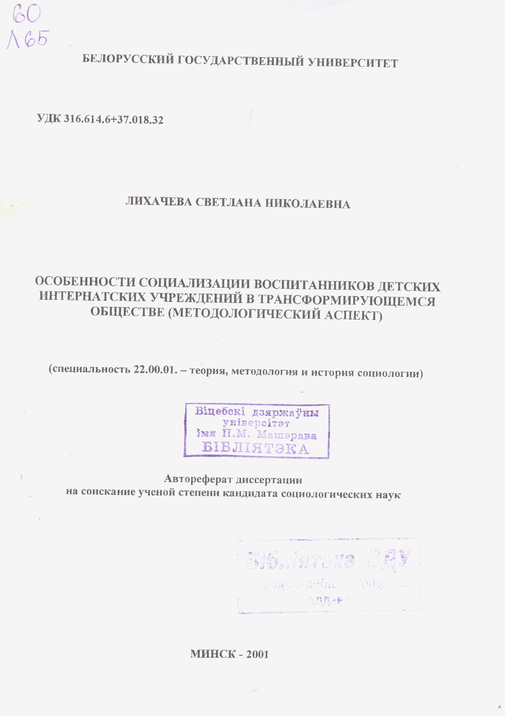 Лихачева, С. Н. Особенности социализации воспитанников детских интернатских учреждений в трансформирующемся обществе (методологический аспект) : автореф. дис. ... канд. социол. наук : 22.00.01 - теория, методология и история социологии / С. Н. Лихачева ; БГУ. - Мн., 2001. - 20 с. - Библиогр.: с. 17.