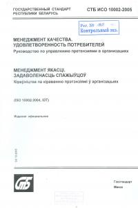 Менеджмент качества. Удовлетворенность потребителей. Руководство по управлению претензиями в организациях : СТБ ИСО 10002-2005 (ISO 10002:2004, IDT) : утв. и введ. в действие постановлением Госстандарта РБ от 29 дек. 2005 г. № 59 / подгот.: БелГИСС. — Изд. офиц. - Введ. 2006-04-01. — Минск : Госстандарт, 2006. — V, 22 c. — Библиогр.: с. 21. — В надзаг.: Государственный стандарт Республики Беларусь.