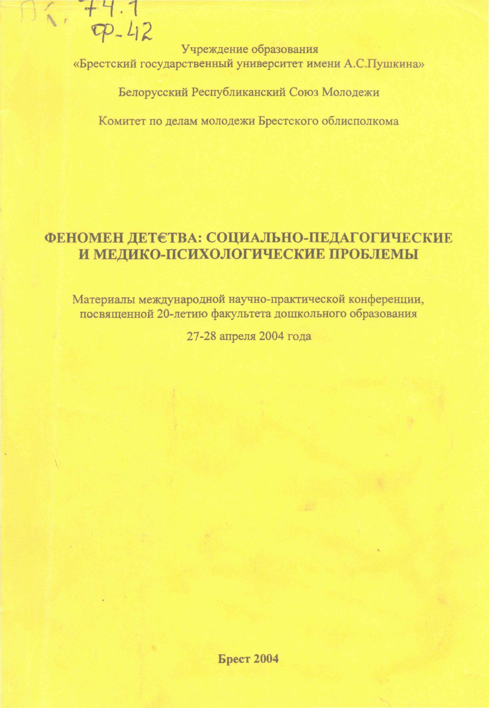 Феномен детства : социально-педагогические и медико-психологические проблемы : материалы Междунар. науч.-практ. конференции, посвящ. 20-летию фак. дошк. образования, 27-28 апреля 2004 года / под общ. ред. М. Э. Чесновского ; УО "БрГУ им. А. С. Пушкина" ; БРСМ ; Комитет по делам молодежи Брестского облисполкома. - Брест : Изд-во УО "БрГУ им. А. С. Пушкина", 2004. - 330 с.