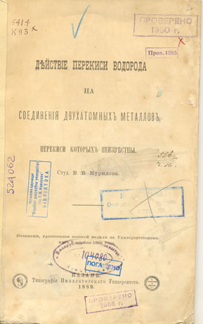Из введения В. В. Курилова: «Цель моей настоящей работы – изучить, хотя отчасти, действие перекиси водорода на некотороые из металлических окисей двухатомных металлов, принадлежащих к той же группе, как и щелочно- земельные металлы, отношение к которым H2O2 является наиболее известным…».