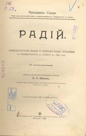 Радiй: общедоступныя лекцiи о природе радiя, читанныя в университете в Глазго в 1908 году / перевел со второго англiйскаго изданiя Н. А. Шилов. - Москва: Типо-литографiя Т-ва И. Н. Кушнерев и К., 1910. - XIV, 168 с. : ил., [12] вкл. л. ил.