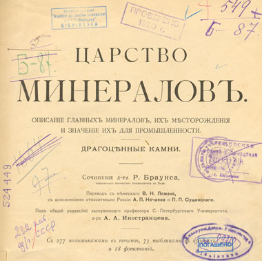 Царство минералов. Описанiе главных минералов, их месторожденiя и значенiе их для промышленности. Драгоценные камни: с 277 политипажами в тексте, 73 таблицами в красках и 18 фототипiй / перевод с немецкаго В. Н. Лемана, с дополненiями относительно Россiи А. П. Нечаева и П. П. Сущинскаго ; под общей редакцiей ...А. А. Иностранцева. - С.-Петербург, [1904?]. - XV, 507 с. + 85 отл. л. табл. - Библиогр. в обл. ссылок.