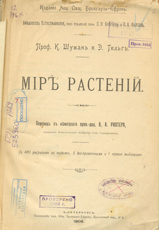 Мiр растенiй: с[о] 480 рисунками в тексте, 5 раскрашенными и 1 черной таблицами / перевод с немецкаго ...А. А. Рихтера. - С.- Петербург, 1906 (Типографiя Акц. Общ. Брокгауз-Ефрон). - 738 с.: ил. - (Библіотека естествознанія / под ред. П. И. Броунова и В. А. Фаусека).