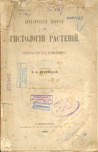 Практическiя занятiя по гистологiи растенiй : руководство для начинающих : с 8-ю рисунками в тексте / составил П. Я. Крутицкiй. - С.-Петербург: Типографiя М. М. Стасюлевича, 1882. - IV, 118 с. - Библиогр.: с. IV.