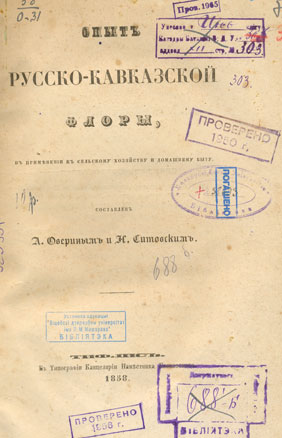 Опыт русско-кавказской флоры, в примененiи к сельскому хозяйству и домашнему быту / составлен А. Овериным и Н. Ситовским. - Тифлис, 1858 (В Типографiи Канцеляріи Наместника Кавказского). - 464, IX с. - Библиогр.: с. VII-VIII.