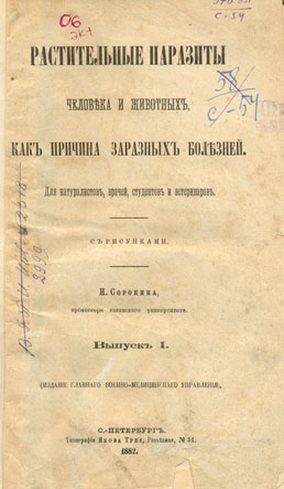 Сорокин, Н. Растительные паразиты человека и животных, как причина заразных болезней: для натуралистов, врачей, студентов и ветеринаров. Вып. 1 / Гл. Военно-медицинское управленiе. - С.-Петербург: Типографiя Якова Трея, 1882. - VIII, 409, XV c., [1] вкл. цв. л. - Библиогр.: с. 401-409 и в обл. ссылок.