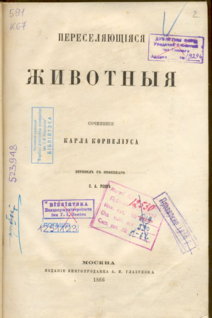 Переселяющiяся животныя / перевел с немецкаго С. А. Усов. - Москва: Изданiе книгопродавца А. И. Глазунова, 1866 (Типографія Грачева и Комп.). - 216 c. - Библиогр. в обл. ссылок.