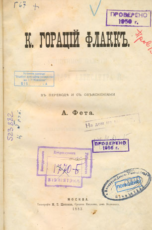 Горацiй Флакк. [Оды] / в переводе и с объясненiями А. Фета. - Москва, 1883 (Типографiя М. П. Щепкина). - XVIII, 485 с. - Библиогр. в обл. ссылок.