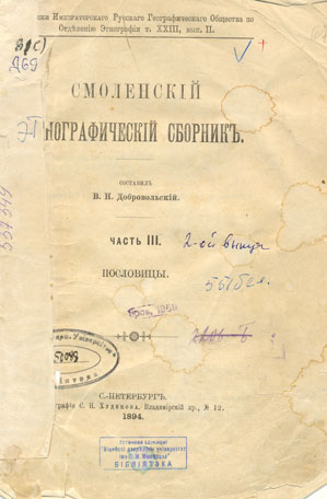 Смоленскiй этнографическiй сборник. Ч. 3 : Пословицы / составил В. Н. Добровольскiй. - С.-Петербург, 1894 (Типографiя С. Н. Худекова). - III, 137 с. - (Записки Императорскаго Русскаго Географическаго Общества по Отделенiю Этнографiи, Т. 23, вып. 2).