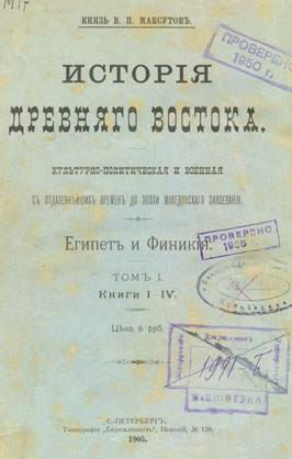 Исторія Древняго Востока. Культурно-политическая и военная. С отдаленнейших времен до эпохи Македонскаго завоеванiя. Т. 1, кн. 1-4 : Египет и Финикiя. - С.-Петербург: [б. и.], 1905 (Типографія "Бережливость"). - XXVIII, 719 с. - Библиогр. на с. XIX-XXIV и в обл. ссылок.