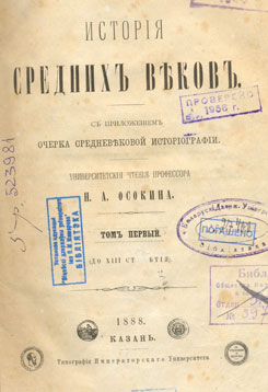 Исторiя средних веков. С приложенiем очерка средневековой исторіографiи. Т. 1 : (До XIII столетiя). - Казань, 1888 (Типографія Императорскаго Университета). - VIII, 608 с. + 115 с. (прил. XXX с.) . - Прил.: Очерк средневековой исторіографiи / Н. А. Осокин. - 115 с. - Библиогр.: I-XXX с.