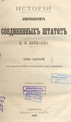 Исторія Американских Соединенных Штатов: перевод с немецкаго. Т. 1 : От основанiя колонiй до президентства Томаса Джефферсона. - С.-Петербург: Изданіе О.И. Бакста, 1866. - XVI, VIII, С. 161-527. - Библиогр. в обл. ссылок. - Экз. деф.: нет с. 1-160.