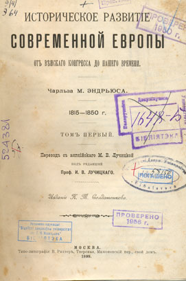 Историческое развитіе современной Европы от Венскаго конгресса до нашего времени / перевод с англiйскаго М.В. Лучицкой ; под редакцiей И.В. Лучицкаго. - Москва: Изданiе К.Т. Солдатенкова, 1899 (Типо-литографія В. Рихтер). - Изд. конволют без общего тит. л., состоящий из двух отдельно изданных томов. - Т. 1: 1815-1850 г. - 355 с. ; Т. 2: 1850-1897 г. - 346, XXII с. - Алф. указ.: с. I-XXII.