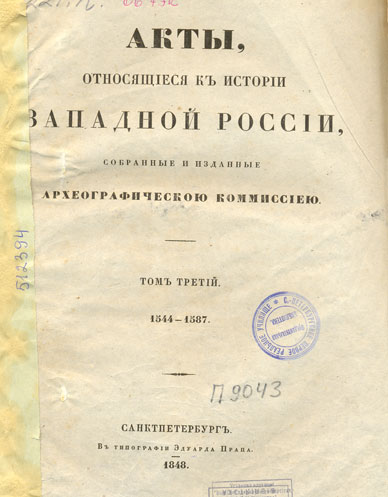 Акты, относящіеся къ исторіи Западной Россіи, собранные и изданные Археографическою Коммиссiею.Том третій : 1544-1587. - Санкт-Петербургъ: Въ типографіи Эдуарда Праца, 1848. - VIII, 317, 17, 14 с.