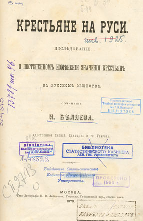 Крестьяне на Руси: изследованiе о постепенном измененiи значенiя крестьян в русском обществе. - Москва, 1879 (Типо-Литографія Н.В. Любенкова). - 306 с. - Книга удостоена премий Демидова и гр. Уварова.