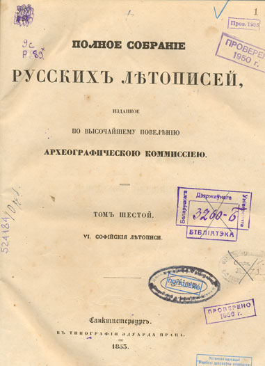 Полное собранiе русских летописей, изданное по Высочайшему повеленiю Археографическою Коммиссiею. Т. 6 : Софiйскiя летописи. - Санктпетербург, 1853 (В типографіи Эдуарда Праца). - 360 с. - Библиогр. в обл. ссылок.