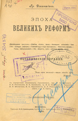 Джаншiев, Г. Эпоха Великих Реформ: историческiя справки : с портретами Белинскаго, Грановскаго, ... С.С. Ланскаго [и др.]. - 7-е дополненное изданiе. - Москва: Типо-лит. К. Ф. Александрова, 1898. - LXX, 896, X с. - Библиогр. в обл. ссылок.