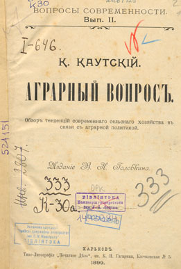 Аграрный вопрос: обзор тенденцій современнаго сельскаго хозяйства в связи с аграрной политикой. - Харьков: Изданiе В.Н. Головкина, 1899 (Типо-Литографія "Печатное дело"). - IV, 366 с. - (Вопросы современности; Вып. II). - Экз. деф.: нет посл. с.