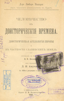 Человечество в доисторическія времена. Доисторическая археологія Европы и в частности славянских земель: с 459-ю рисунками и картою / перевод с чешскаго Ф.К. Волкова ; под редакцiей Д.Н. Анучина. - С.-Петербург: Изданіе Л.Ф. Пантелеева, 1898. - XXVII, 655 с. - Библиогр. в обл. ссылок и на с. VIII-XXVII, 599-643.