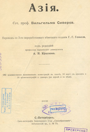 Азія: 182 художественно исполненных иллюстрацiй в тексте, 16 карт в красках и 20 хромолитографiй и гравюр (на дереве и меди) / перевод со 2-го переработаннаго немецкаго изданiя Г. Г. Генкеля, под редакцiей ...А. Н. Краснова. - С.-Петербург: Книгоиздательское Товарищество "Просвещенiе", [1905-?] (Типо-литографія Акціонернаго О-ва "Самообразованіе"). - XI, 758 с. - (Всемiрная географiя / под общ. ред. В. Сиверса ; [Т. 2]). - Библиогр.: с.707-720. - Второй тит. л.: серия "Всемiрная географiя" / под общ. ред. ...В. Сиверса и "Земля и жизнь. Сравнительное земледелiе" / Ф. Ратцеля.