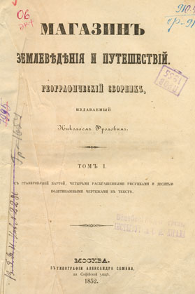 Магазин землеведенiя и путешествiй : географическiй сборник, издаваемый Н. Фроловым : с гравированной картой, четырьмя раскрашенными рисунками и десятью политипажными чертежами в тексте. Т. 1 / [предисловiе Н.Фролова]. - Москва: Издатель Н. Фролов : В типографiи А. Семена, 1852. - IV, 758, X с. : ил. , [2] вкл. цв. л., карта.