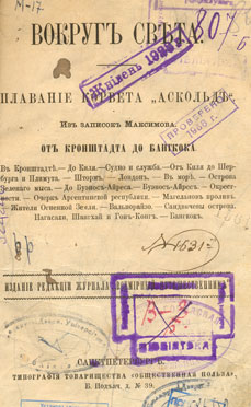 Вокруг света. Плаваніе корвета "Аскольд". От Кронштадта до Бангкока: из записок Максимова. - Санктпетербург: Изданiе редакцiи журнала "Всемирный путешественник", [1872?] (Типографія товарищества "Общественная польза"). - V, 480 c.