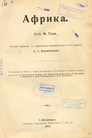 Африка / полный перевод, с совершенно переработаннаго 2-го изданiя, Д. А. Коропчевскаго ; 173 рисунка в тексте, 11 карт в красках и 21 цветных и черных картин, исполненных О. Винклером, Э. Гейном, Э. Т. Комптоном [и др.]. - С.-Петербург: Книгоиздательское Т-во "Просвещенiе", 1903 (Типографія Товарищества "Просвещеніе"). - XII, 644 с. - (Всемiрная географiя / при сотрудничестве ...Ф. Гана, ...Э. Деккерта,...В. Кюкенталя [и др.] ; под общ. ред. В. Сиверса). - Библиогр.: с. 601-602.