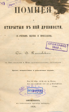 Помпея и открытыя в ней древности, с очерком Везувія и Геркуланума: с 3-мя планами и 33-мя пояснительными рисунками. - Третье, исправленное и дополненное изданiе . - Санктпетербург, 1856 (В типографіи Эдуарда Веймара). - XIX, 349 с. - Библиогр.: с. XII-XIII.