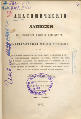 Анатомическiя записки для обучающихся живописи и скульптуре, в Императорской Академiи художеств / издал заслуженный профессор анатомiи, доктор медицины и хирургiи, действительный статскiй советник... И. Буяльскiй . - Санктпетербург: [В типографiи В. Прохорова], 1860. - IV, 167 с. + 2 отд. л. (прилож.). - Библиогр.: с. 165-167.