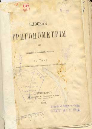 Плоская тригонометрiя для гимназiй и реальных училищ. - С. Петербург: В типографiи В. Безобразова и Комп., 1881. - 127 с., [3] вкл.л. - На обл. надпись : Удостоенная премiей Петра Великаго.