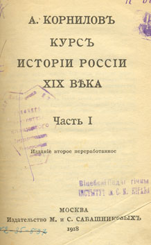 Курс исторiи Россiи XIX века. Ч. 1 . - Изданiе второе переработанное. - Москва: Издательство М. и С. Сабашниковых, 1918. - 283 с. - Библиогр.: с. 271-280.