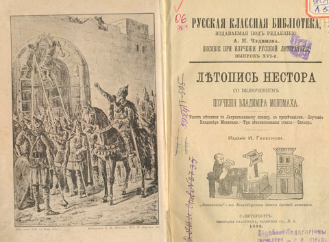 Летопись Нестора со включенiем "Поученiя Владимира Мономаха". - С.-Петербург: Изданiе И. Глазунова , 1893. - III, 190 с. , [1] вкл. л. ил. - (Русская классная библiотека, / издаваемая под редакцiею А.Н. Чудинова. Пособiе при изученiи русской литературы ; вып. XVI-й). - Содерж.: Текст летописи по Лаврентьевскому списку, с примечанiями ; Поученiе Владимiра Мономаха ; Три объяснительныя статьи ; Словарь. - На тит. л. ил. "Летописец" - из Кенигсбергскаго списка древней летописи.