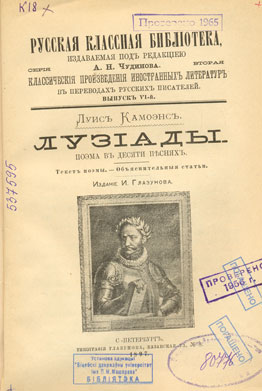 Лузiады: поэма в десяти песнях : текст поэмы, объяснительныя статьи / Л. Камоэнс. - С.-Петербург: Изданiе И. Глазунова, 1897. - III, 191 с., портр. - (Русская классная библiотека, / издаваемая под редакцiею А. Н. Чудинова, Серiя вторая. Классическiя произведенiя иностранных литератур в переводах русских писателей. Вып. VI-й).