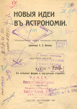 Новыя идеи в астрономiи. Сборник второй : Земля. Ея внешняя форма и внутреннее строенiе / неперiодическое изданiе, выходящее под ред. А.А. Иванова. - СПБ: Изд-во "Образованiе", 1913. - 154 с. - Экслибрис книгоиздательства "Образованiе" СПБ.