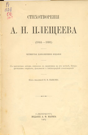 Стихотворенiя: с портретом автора, снимком с памятника на его могиле, бiографическим очерком, факсимиле и библiографiей стихотворенiй / под редакцiей П.В. Быкова. - Четвертое дополненное изданiе. - С.-Петербург: Изданiе А.Ф. Маркс , 1905. - XL, 834, XIII c. - Библиогр.: с. 797-818. - Алф. указ.: с. 819-834.