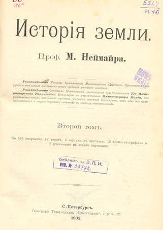 Исторiя земли: для фундаментальных библiотек всех средних учебных заведенiй, как одно из капитальнейших и строго научных сочиненiй по отделу естествознанiя. Первый том / перевод со 2-го немецкаго изданiя, переработаннаго и дополненнаго проф. В. Улигом, с дополненiями по геологiи и библiографическим указателем В.В. Ламанскаго и А.П. Нечаева ; под редакцiей заслуженнаго профессора Императорскаго С.-Петербурскаго университета А.А. Иностранцева. - С.-Петербург: Типографiя Товарищества "Просвещенiе", 1903. - 761 с. : ил., [6] вкл. л., [14] вкл. цв. л., [4] вкл. цв. карты. - Библиогр. в обл. ссылок.