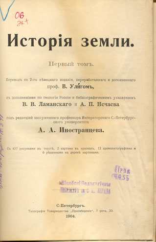 Исторiя земли: для фундаментальных библiотек всех средних учебных заведенiй, как одно из капитальнейших и строго научных сочиненiй по отделу естествознанiя. Первый том / перевод со 2-го немецкаго изданiя, переработаннаго и дополненнаго проф. В. Улигом, с дополненiями по геологiи Россiи и библiографическим указателем В.В. Ламанскаго и А.П. Нечаева ; под редакцiей заслуженнаго профессора Императорскаго С.-Петербургскаго университета А.А. Иностранцева. - С.-Петербург: Типографiя Товарищества " Просвещенiе", 1904. - 761 с. : ил., [6] вкл. л., [14] вкл. цв. л., [4] вкл. цв. карты.
