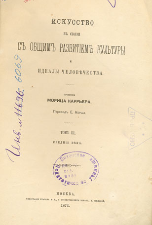 Искусство в связи с общим развитiем культуры и идеалы человечества. Том III : Среднiе века / сочиненiе М. Каррьера ; перевод Е. Корша. - Москва: Типографiя Грачева И. и К., у Пречистенских ворот , 1874. - XV, 672, 31 с.