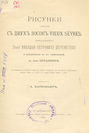Рисунки, снятые с двух досок VIEUX SEVRES, принадлежавших Графу Николаю Петровичу Шереметеву и находившихся в его подмосковной, в селе Останкине / описал А. Карбоньер. - С.-Петербург: Типографiя А. Бенке, 1894. - 8 с. + 4 отд. л. (прилож.). - На тит. л. запись : Сохранившаяся на обратной стороне их [рисунков] надпись указывает, что оне некогда принадлежали собранiю Бужона "DU CABINET DE M. BOUJON, PREMIER GENERAL A PARIS".