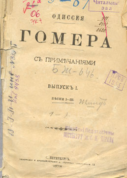 Гомер. Одиссея. - С.-Петербург: Типографiя и хромолитографiя А. Траншеля. - 265 с. разд. паг. - Изд. конволют без общ. тит. л., состоящий из трех, отдельно изданных выпусков. - Содерж.: Вып. I : Песни I-III : с примечанiями. - 1878. - 96 с. : ил. ; Вып. II : Песни IV-VI : с примечанiями Е. Шмида. - 1878. - 90 с. ; Вып. III : Песни VII-IX : с примечанiями Е. Шмида. - 1880. - 79 с.