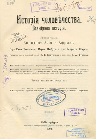 Исторія человечества. Всемірная исторія: полный перевод с[о] значительными дополненiями для Россiи избранных русских ученых : для фундаментальных библiотек средних учебных заведенiй ведомств учрежденiй Императрицы Марiи : с 260 отдельными приложенiями, из них 60 хромолитографiй, 55 карт в красках и 145 черных картин. Т. 3 : Западная Азія и Африка / ... Г.Винклера, К. Нибура, ... Г. Шурца ; перевод под ред. ...В.В. Бартольда и ...Б.А. Тураева ; с 7 картами, 7 цветными и 22 черными таблицами, исполненными А. Биллербеком, ...Ф. Эцольдом, ... М. Кюнертом [и др.] / составители: ...Г. Адлер, К. Арендт, Т. Ахелис [и др.] ; под общей редакцiей ... Г. Гельмольта ; дополненiя перевода, сделаннаго Б.Ф. Адлером, А.И. Браудо, А.А. Вейнбергом [и др.]. - Второе изданiе со стереотипа. - С.-Петербург: Книгоиздательское Т-во "Просвещеніе", 1904. - XI, 742 с. - Алф. указ.: с. 701-733.