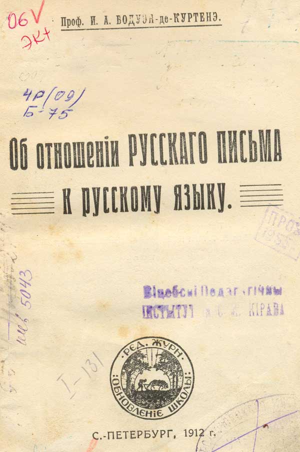 Об отношенiи русскаго письма к русскому языку / Бодуэн -де- Куртенэ И. А. - С.-Петербург : Ред. журн."Обновленiе школы", 1912 ( : [Тип. Т-ва А. Ф. Маркс] ). - 132, VI c.