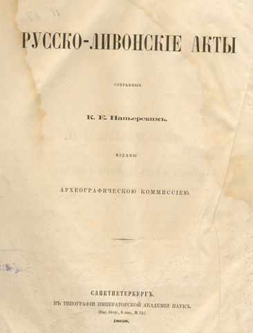 Русско-ливонскiе акты. / собранные К.Е. Напьерским. - Санктпетербург : Изданы Археографическою Коммиссiею : В типографiи Императорской Академiи наук, 1868. - XXIII, 462 с. - Библиогр. в обл ссылок. - Тит. л. парал. рус., нем. - С автографом и оттиском штампа А.П. Сапунова.