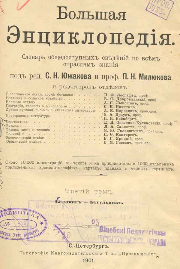 Большая Энциклопедiя : словарь общедоступных сведенiй по всем отраслям знанiя . Т. 3 : Беллинг - Бугульник / под ред. С. Н. Южакова и П. Н. Милюкова . - Санкт-Петербург : Книгоиздательское Т-во "Просвещенiе", 1901 ( : Типографiя Книгоиздательского Т-ва "Просвещенiе"). - 800 с. : ил., [9] вкл. л., [2] вкл. цв. л., [11] вкл. карт. - Библиогр. в конце статей.