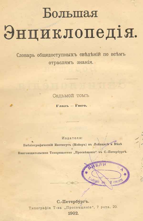Большая Энциклопедiя : словарь общедоступных сведенiй по всем отраслям знанiя . Т. 7 : Глаз - Гюго / под ред. С. Н. Южакова . - Санкт-Петербург : Библiографическiй Институт (Мейер) в Лейпциге и Вене : Книгоиздательское Т-во "Просвещенiе" в С.-Петербурге, 1902. - 798 с. : ил., [24] вкл. л., [3] вкл. цв. л., [2] вкл. цв. карт. - Библиогр. в конце статей.