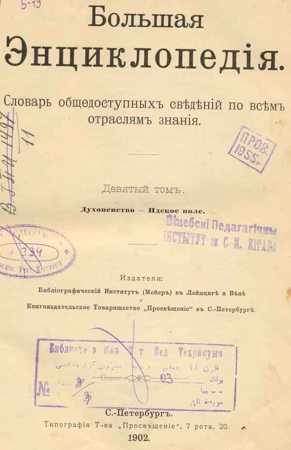 Большая Энциклопедiя : словарь общедоступных сведенiй по всем отраслям знанiя . Т. 9 : Духовенство - Идское поле / под ред. С. Н. Южакова . - Санкт-Петербург : Библiографическiй Институт (Мейер) в Лейпциге и Вене : Книгоиздательское Т-во "Просвещенiе" в С.-Петербурге, 1902. - 798 с. : ил., [21] вкл. л., [3] вкл. цв. л., [19] вкл. цв. карт. - Библиогр. в конце статей.