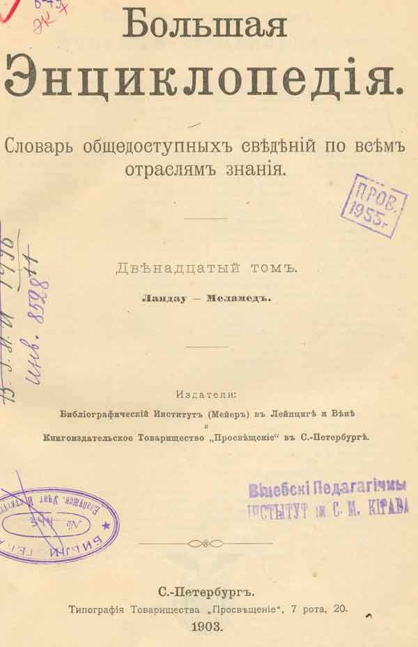 Большая Энциклопедiя : словарь общедоступных сведенiй по всем отраслям знанiя . Т. 12 : Ландау - Меламед / под ред. С. Н. Южакова . - Санкт-Петербург : Библiографическiй Институт (Мейер) в Лейпциге и Вене : Книгоиздательское Т-во "Просвещенiе" в С.-Петербурге, 1903. - 800 с. : ил., [31] вкл. л., [1] вкл. цв. л., [6] вкл. цв. карт. - Библиогр. в конце статей.