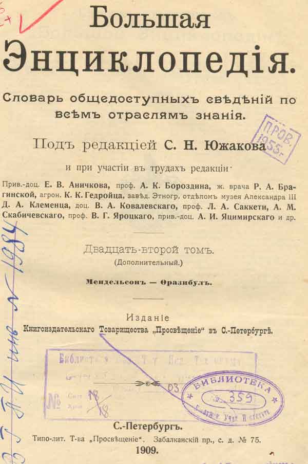 Большая Энциклопедiя : словарь общедоступных сведенiй по всем отраслям знанiя . 22 т. (Дополнительный) : Мендельсон - Фразибул / под ред. С. Н. Южакова . - Санкт-Петербург : Книгоиздательское Т-во "Просвещенiе" в С.-Петербурге, 1909 ( : Типо-лит. Т-ва "Просвещенiе"). - 682 с. : ил., [13] вкл. л., [5] вкл. цв. л., [6] вкл. цв. карт. - Библиогр. в конце статей. - Системат. указ. особых прилож. к I - ХХII томам : с. 675-680.