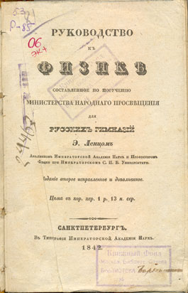 Руководство к физике: составленное по поручению Министерства Народнаго просвещенiя для русских гимназiй. - Изданiе второе, исправленное и дополненное. - Санктпетербург: В Типографiи Императорской Академiи Наук, 1842. - 576 с. : [11] вкл. л.
