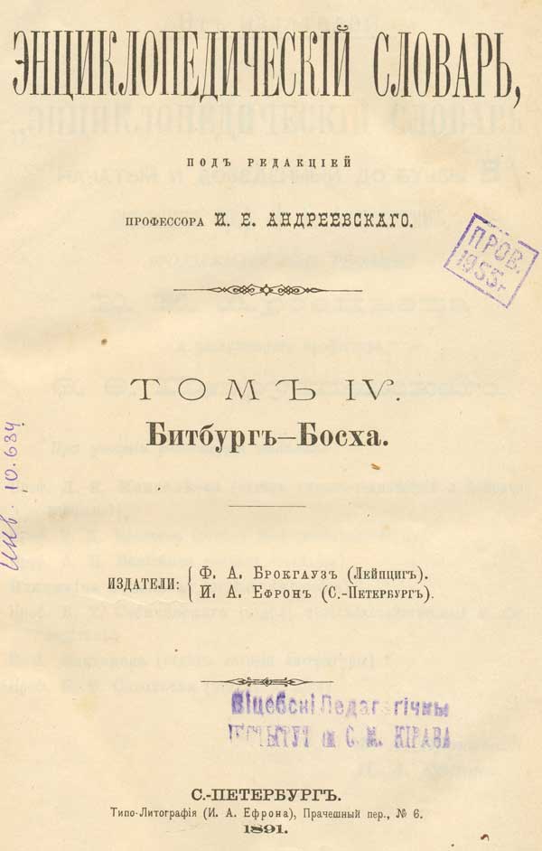 Энциклопедическiй словарь,.Т. 4 : Битбург - Босха / под ред. И. Е. Андреевскаго. - Санкт-Петербург : Типо-Литографiя (И. А. Ефрона) : Изд. Ф. А. Брокгауз (Лейпциг), И. А. Ефрон (С.-Петербург) , 1891 . - I-VIII, 472 с., [7] вкл. л. ил., [2] вкл. цв. л. - Библиогр. в конце ст. - На корешке переплета Т. 7.